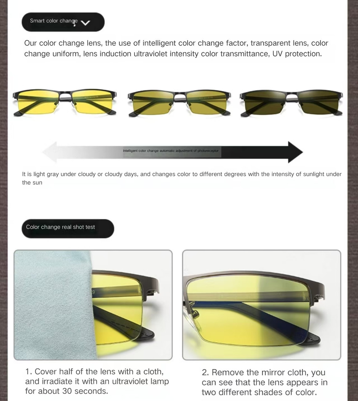 - Градиентный тест: После 30-секундного воздействия УФ-лампы на половину линзы наблюдается чёткое разделение на светлую/тёмную зоны, что подтверждает адаптацию к интенсивности излучения.