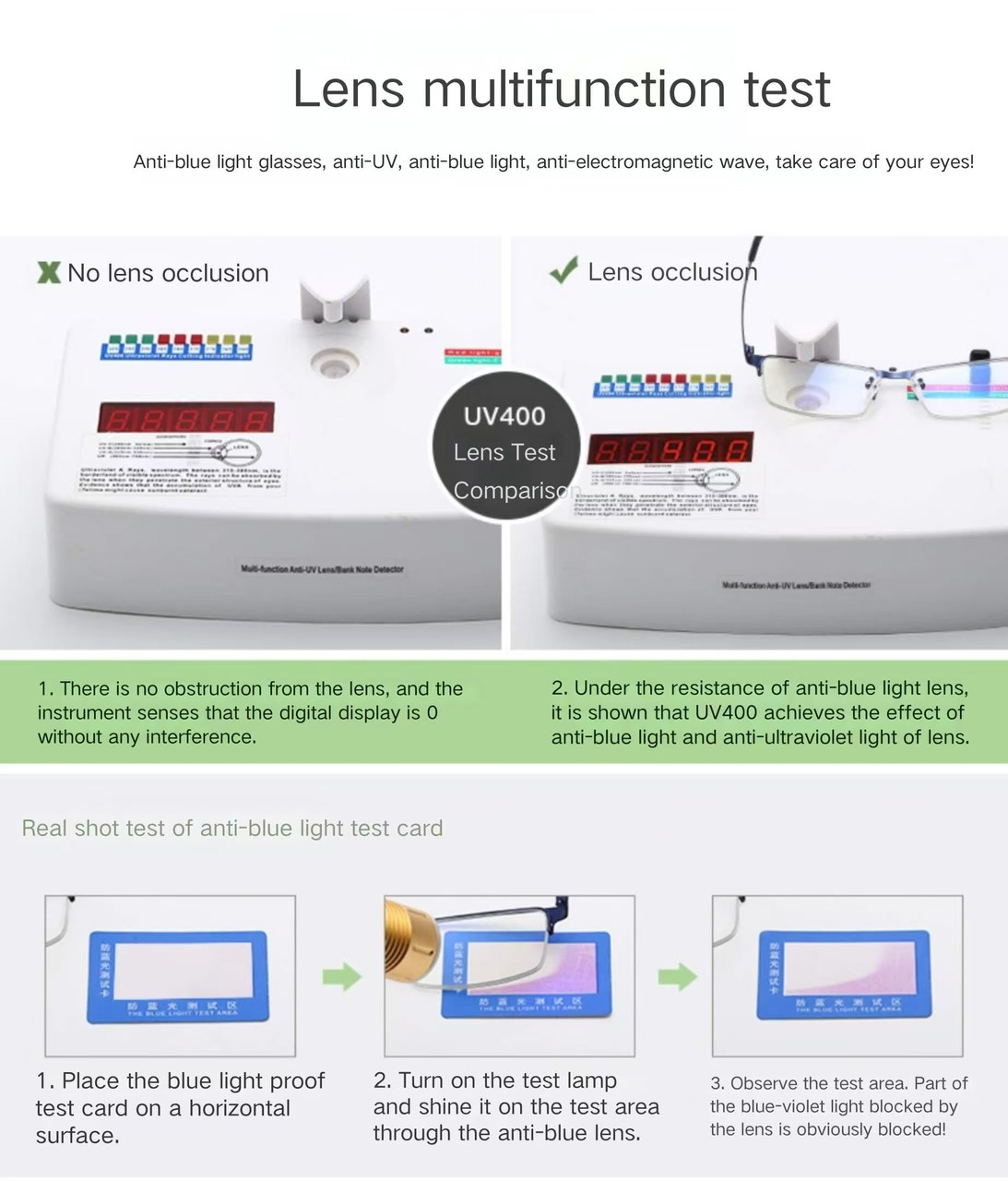 - Прибор фиксирует полное блокирование УФ-излучения (показатель «UV400») при использовании линз, тогда как без линз уровень защиты равен 0.
