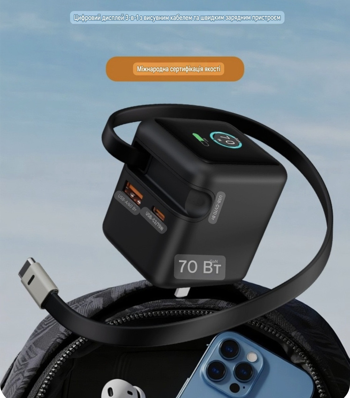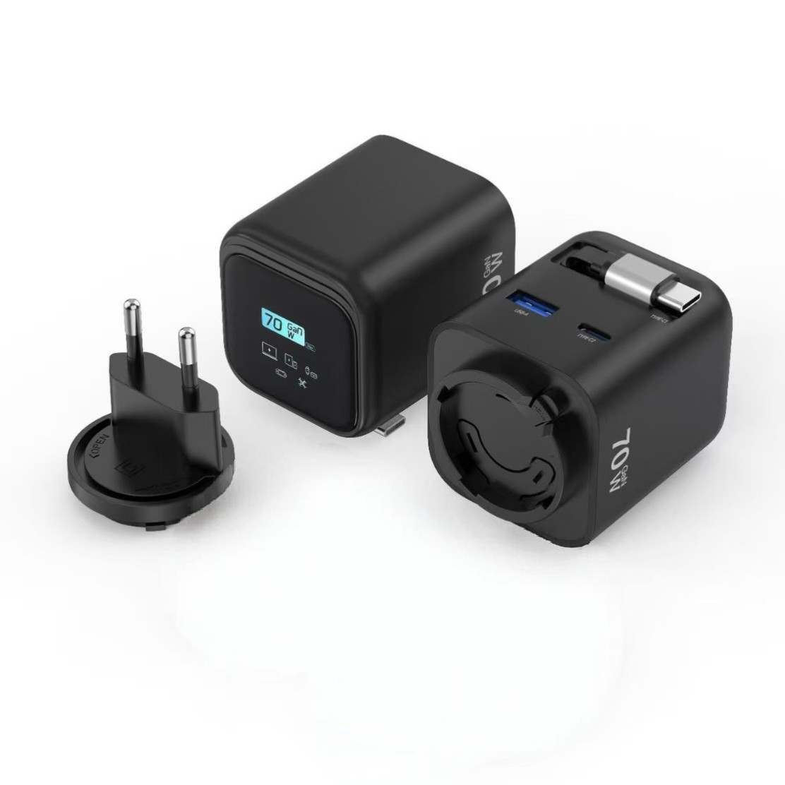 70W GaN — сверхкомпактная зарядка с цифровым дисплеем, выдвижным кабелем и сменной вилкой
