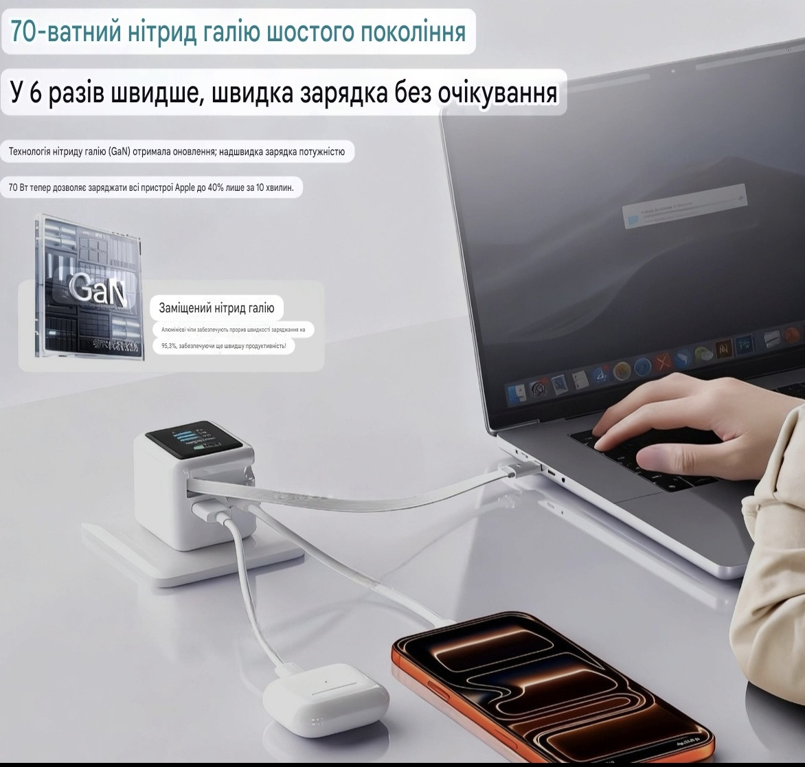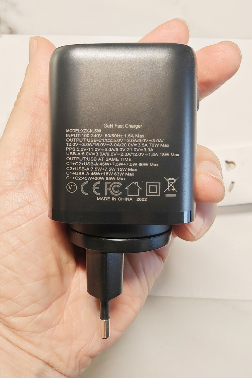 - Совместимость — PD 3.0, QC 4.0+, PPS, SCP, AFC: заряжает iPhone (до 27–45W), Samsung (Super Fast), ноутбуки (MacBook Air/Pro до 70W), AirPods и т.д.