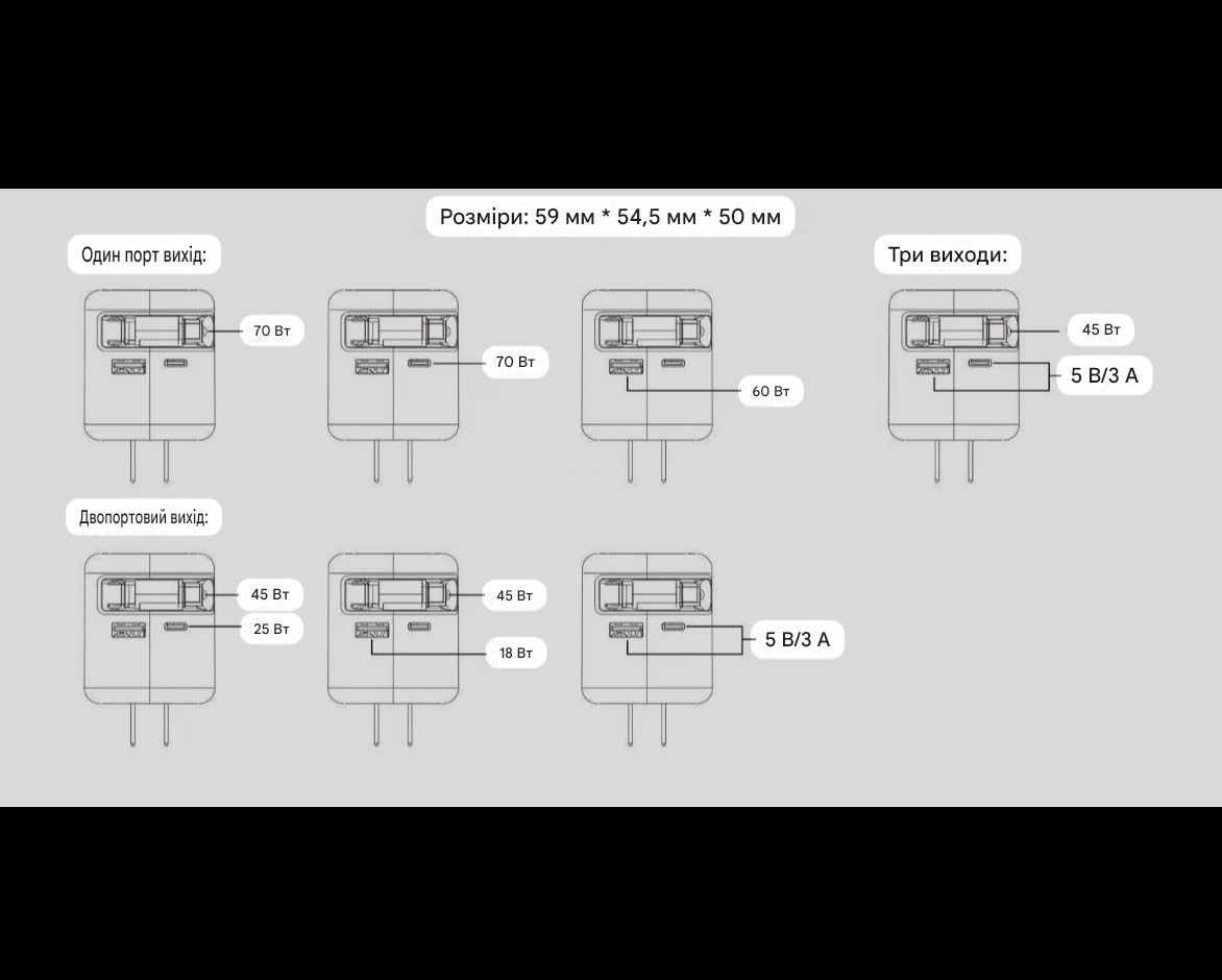 Это современное GaN-зарядное устройство (нитрид галлия) обеспечивает высокую мощность в миниатюрном корпусе. Подходит для зарядки ноутбуков, смартфонов, планшетов и других гаджетов с поддержкой протоколов PD/QC/PPS. Размеры: всего 59 × 54.5 × 50 мм — помещается в карман или сумку.