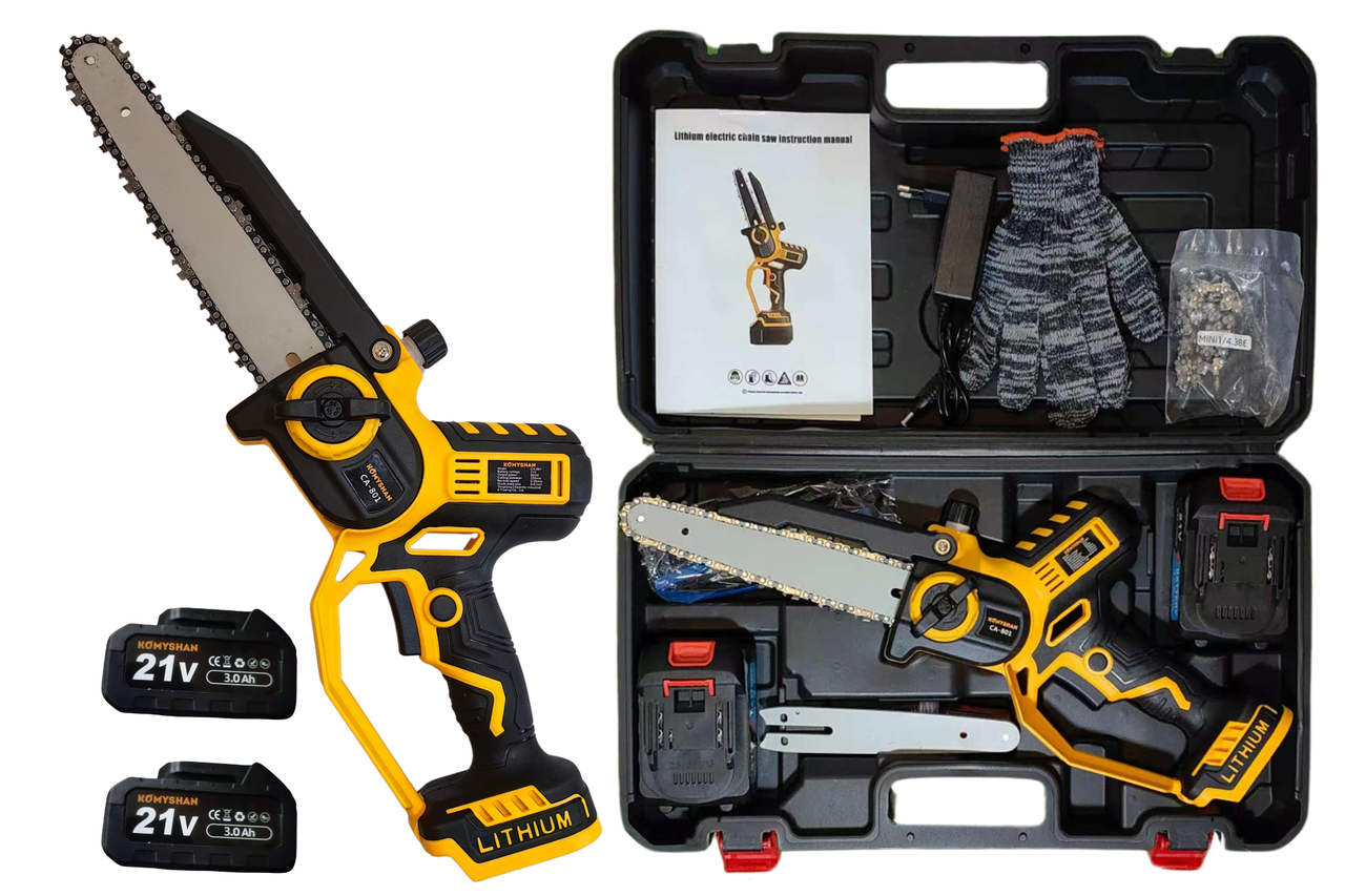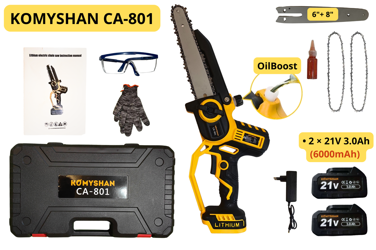 Аккумуляторная пила KOMYSHAN CA-801 — 800W, 2 АКБ ×21V 6000mAh! , автосмазка, 2 шины (6″/8″), кейс/2 цепи