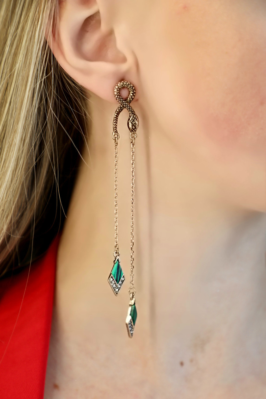 Длинные сережки в виде змей. Серьги-змеи с натуральными камнями на цепочках