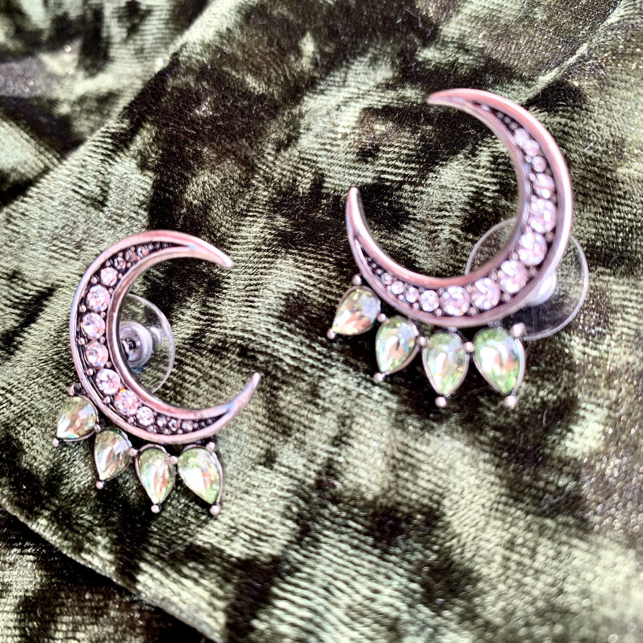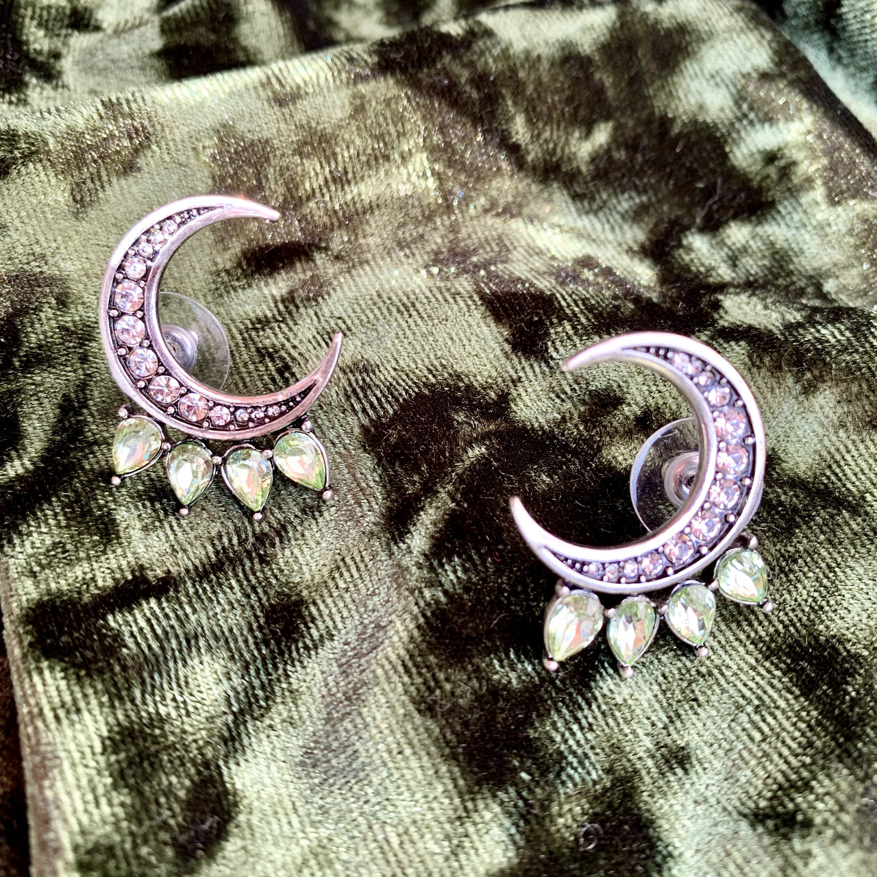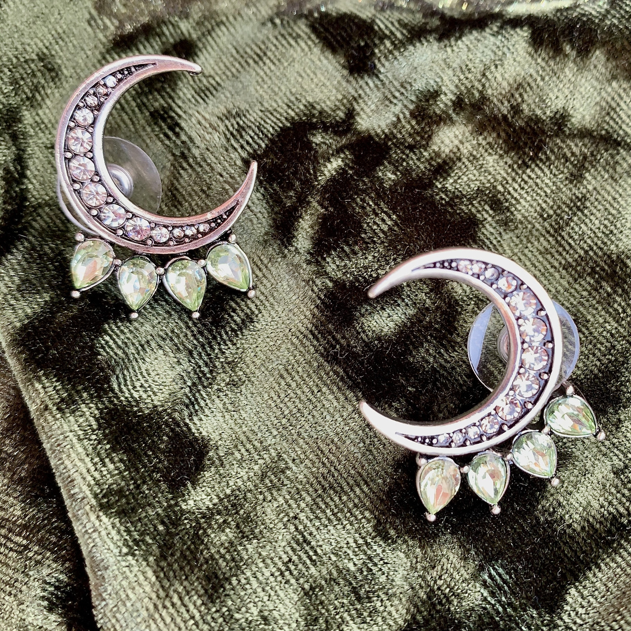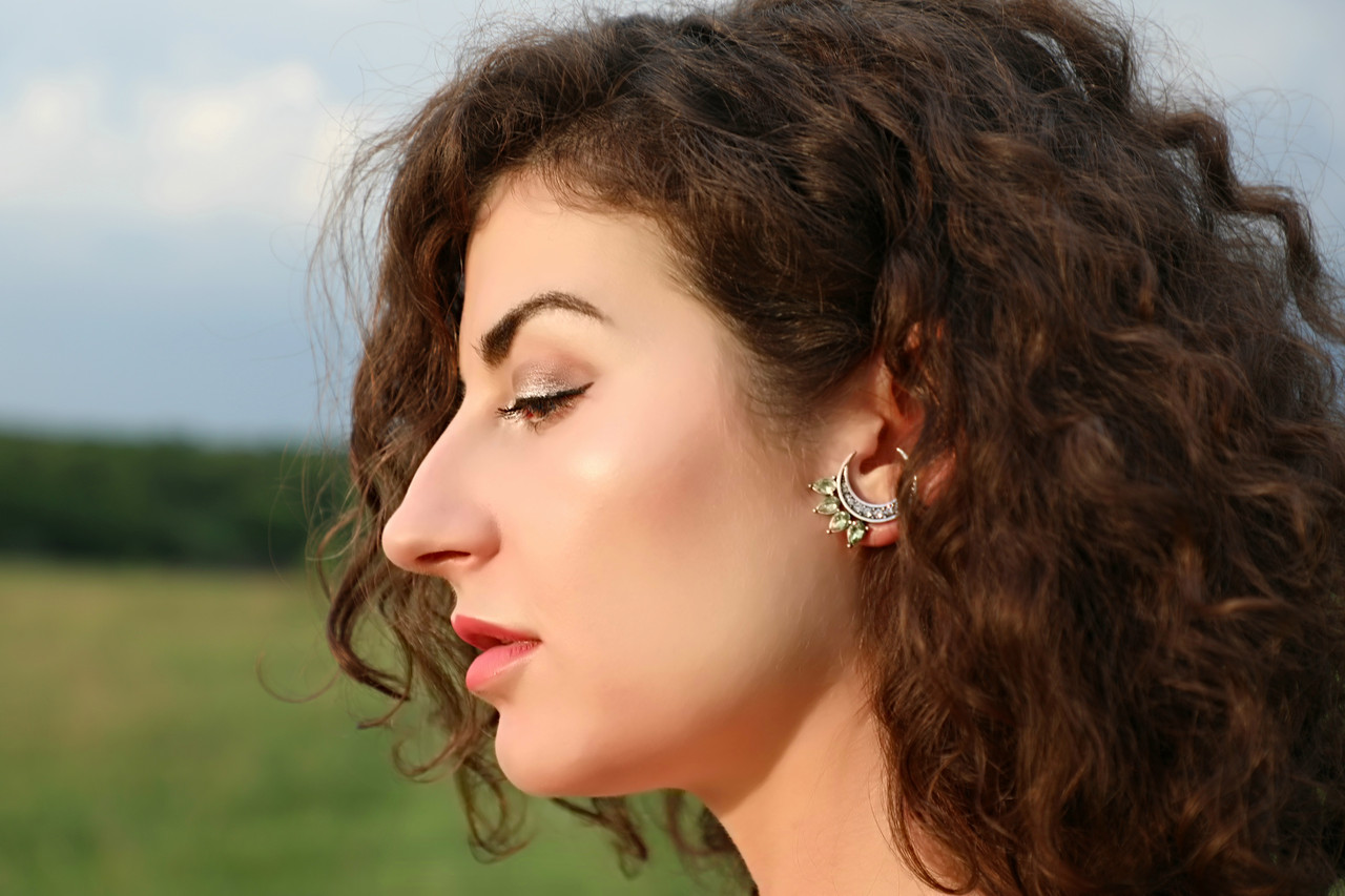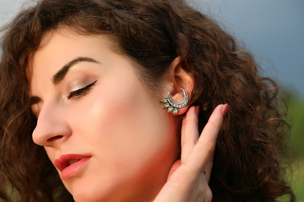 Эльфийские сережки в форме полумесяцев, инкрустированных блестящими камнями и мятными кристаллами. Выглядят свежо и нетривиально. Необычная посадка на ухе не оставит Вас без внимания. Покрытие под винтажное серебро. Застежка — гвоздик.