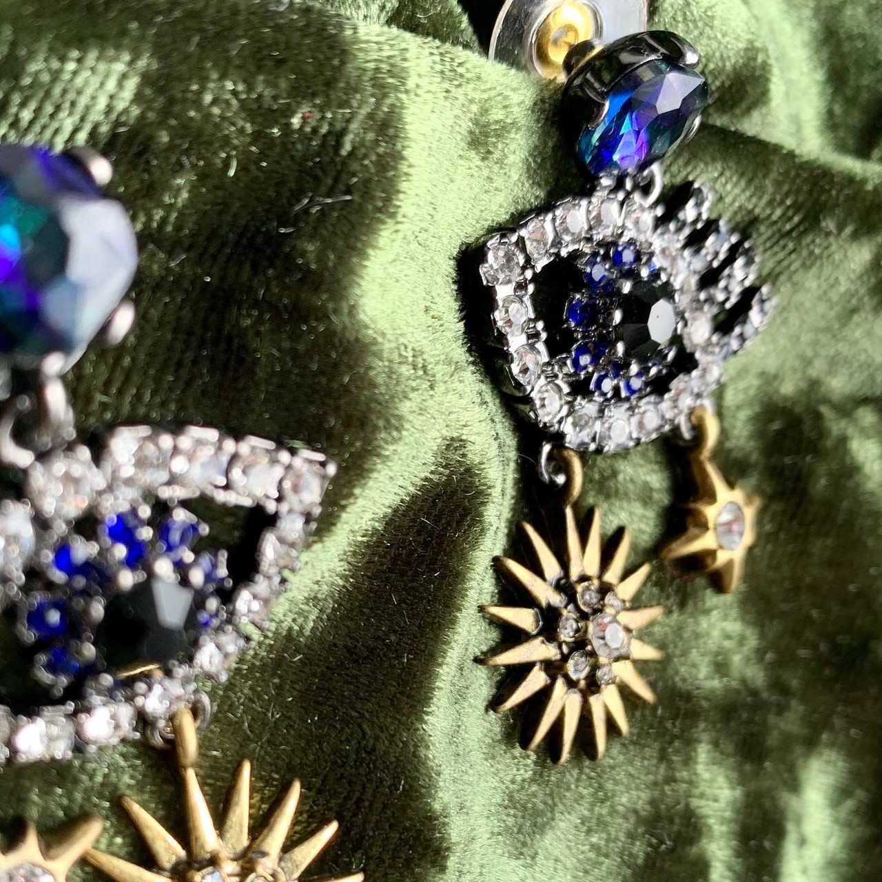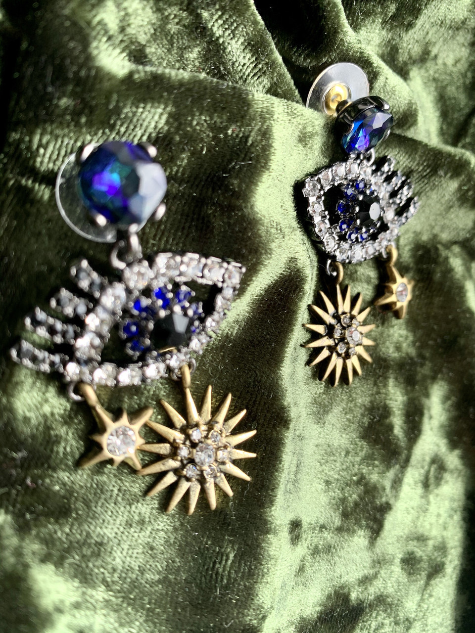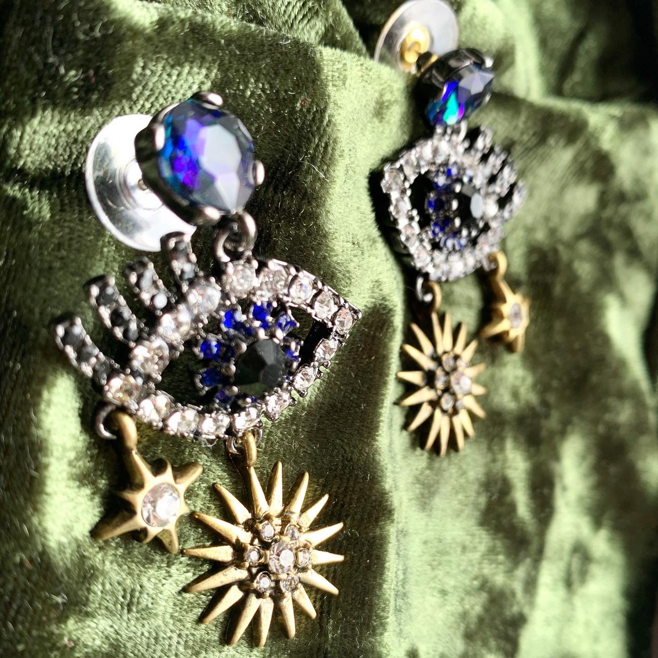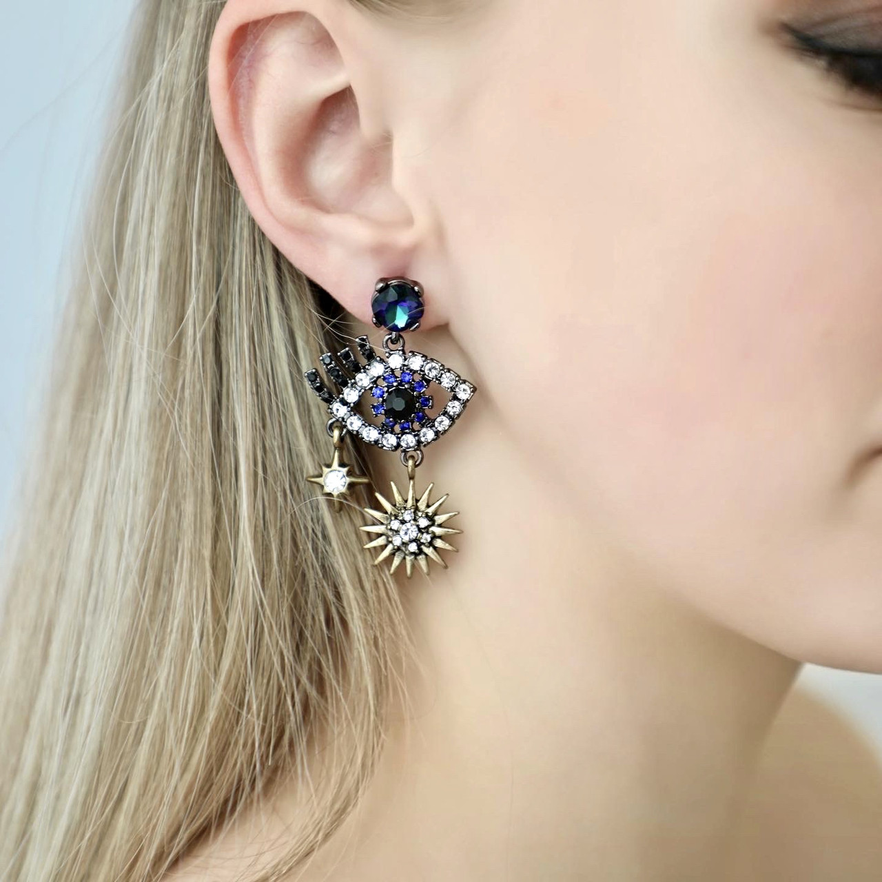 Серьги в форме глаз, украшенные сизыми мерцающими камнями. Внизу сережек позолоченные звезды с винтажным чернением. Подойдут для создания яркого и концептуального образа.