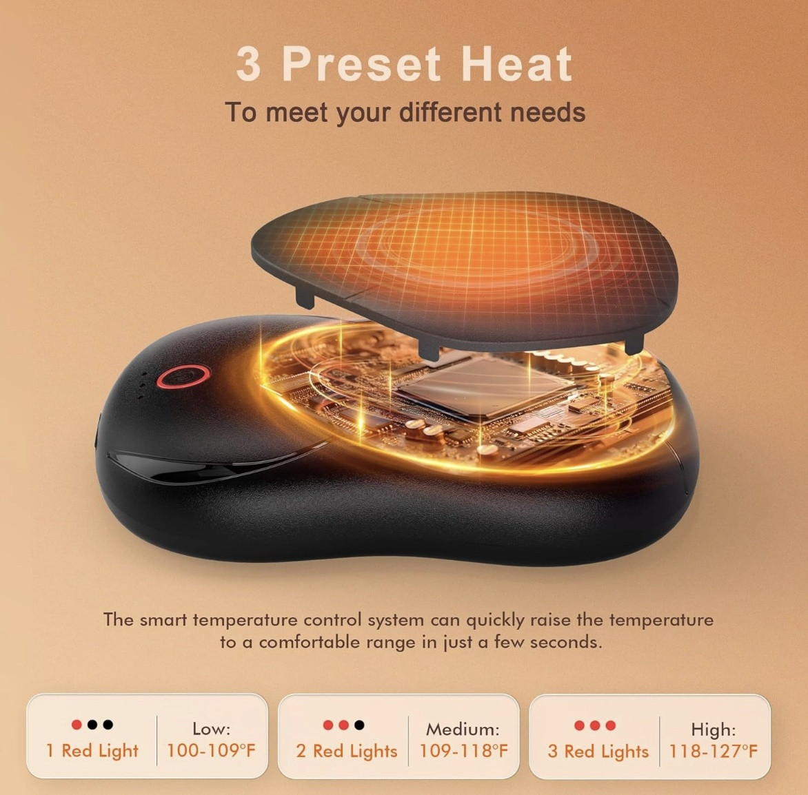 - 3 уровня нагрева: Низкий (100-109°F / 1 красный), Средний (109-118°F / 2 красных), Высокий (118-127°F / 3 красных)