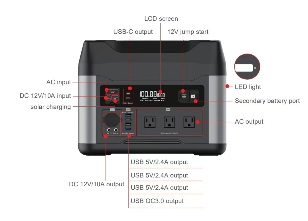 - Возможность одновременной зарядки до 12 устройств и поддержка сквозной зарядки. Включая 3 розетки переменного тока 220 В/1500 Вт, 2 выхода постоянного тока 12 В/10 А DC5521, 1 автомобильный порт 12 В/10, 3 выхода USB-A, 1 выход USB-QC и 2 выход TYPE-C PD60W.
