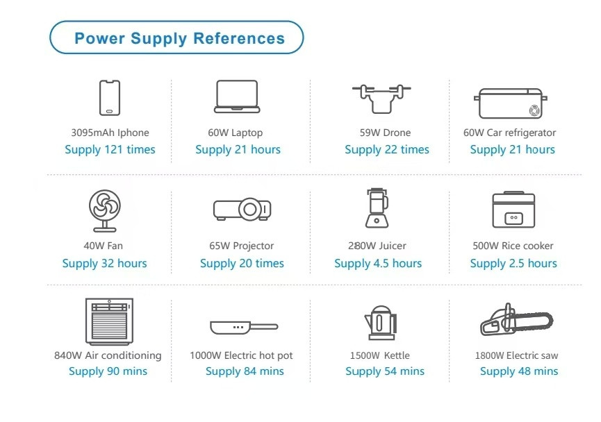 Эта электростанция будет вашим надежным помощником при аварийных отключениях света, энергонезависимого питания ваших бытовых устройств, на работе, дома или на природе. Является источником питания для холодильников, электрочайников, электроплит, микроволновок, электрообогревателей, водоподогревателей, глубинных насосов, кондиционеров, смартфонов, электроинструментов, телевизоров, ноутбуков, фотоаппаратов, мультиварок, соковыжималок, вентиляторов и многих других устройств мощностью до 1500 Вт.