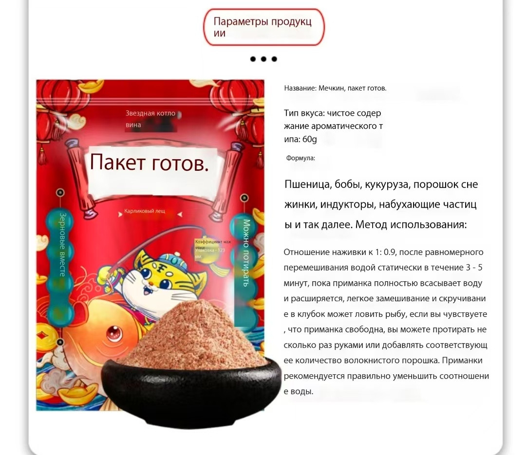 Рыболовная приманка высокого качества для рыба особенно карп, карась. Быстро привлекает рыбу легко клюет. Быстрый способ приготовления путём смешивания воды с приманкой. Подходит как для ловли в пресной морской воде. Срок годности 12 месяцев вес приманки 60 г в пакете.